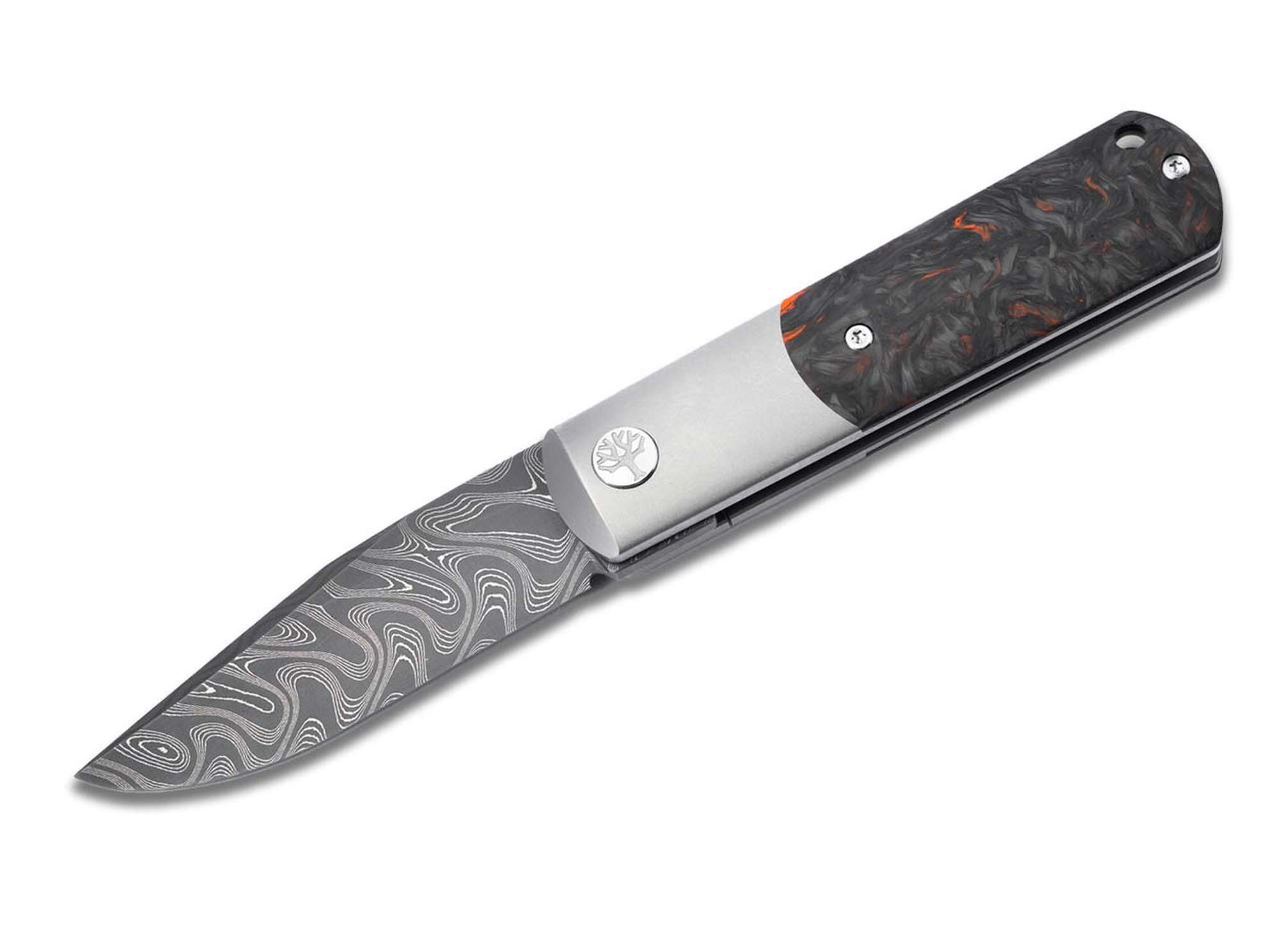 Inovativní koncepty, nejvyšší kvalita výroby a vyladěný výběr materiálů – pro někoho další měřítko, pro nás samozřejmost. Naše měrná jednotka od roku 1869: nefiltrovaná vášeň pro fascinující nože! Přesně to je případ výročního nože Böker Damascus 2024. Tento štíhlý sběratelský nůž, inspirovaný nožem Böker BRLW, přebírá design klasického nože Barlow a akcentuje ho moderním způsobem. Stylisticky určujícím prvkem je opticky odsazená a precizně frézovaná titanová rukojeť, která v přední části podle staré tradice cituje charakteristický, mimořádně dlouhý bolster a v zadní části rukojeti jej vkusně rámuje divokými střenkami rukojeti z tlustého karbonu ve vzoru Dark Matter Orange. Diskrétně integrovaná pojistka framelock uzamyká čepel s kuličkovým ložiskem clip point ze 100vrstvého damašku, kterou Chad Nichols ručně vykoval v úchvatném vzoru Black Boomerang. K elegantnímu vzhledu přispívá diskrétní flipper a plochý frézovaný titanový klip (tip-up/r), zatímco strom Böker dekorativně zdobí šroub osy čepele na přední straně. Otvor na šňůrku na rukojeti poskytuje další možnosti nošení. Výroční nůž, jehož počet je celosvětově přísně omezen na 999 kusů, je dodáván s kvalitním rámovým pouzdrem a certifikátem pravosti. Ruční výroba v manufaktuře Böker v Solingenu.