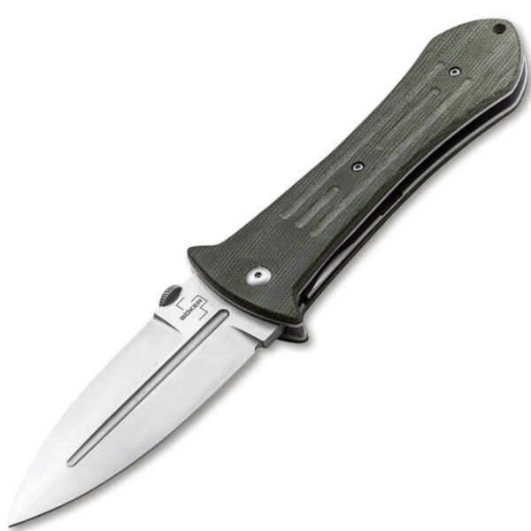 Robustní Pocket Smatchet je vybaven čepelí hrotu oštěpu ve tvaru listu vyrobeného z VG-10, která je opatřena odolnou povrchovou úpravou stonewash. Odnímatelný čep na palec na zadní straně čepele umožňuje otevírání čepele oběma rukama, zatímco stabilní zámek vložky ji spolehlivě zajistí na místě. Dekorativní drážka pokračuje na protiskluzových úchytných panelech ze zelené plátěné micarty, které jsou díky jemné textuře obzvláště bezpečné v ruce. Stabilní spona (sklopení / r) je vyfrézována z masivního materiálu a je také vybavena charakteristickými prohlubněmi klasického smatchetu. S otvorem na krk a vysoce kvalitním nylonovým pouzdrem pro uložení.