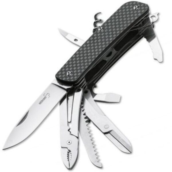Funkce: Vývrtka, otvírák na láhve, hladká čepel, nůžky, kleště, pilka, kroužek na klíče, rozbíječ skla, propichovač.